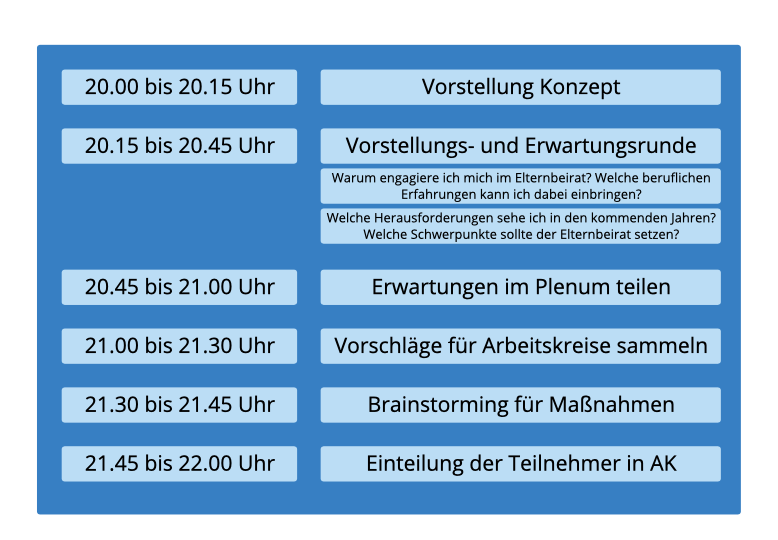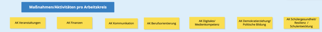 Start der gemeinsamen Zusammenarbeit ist ein Strategiemeeting, bei dem die Erwartungen, Ziele und Schwerpunkte ausgetauscht und auf Basis der Einschätzungen die entsprechenden Arbeitskreise gebildet werden. Aufbauend auf diesen Erfahrungen hat der neu gewählte Elternbeirat in der konstituierenden Sitzung im November 2024 entschieden erstmals auch Schüler:innen der SMV in das Strategiemeeting einzuladen.