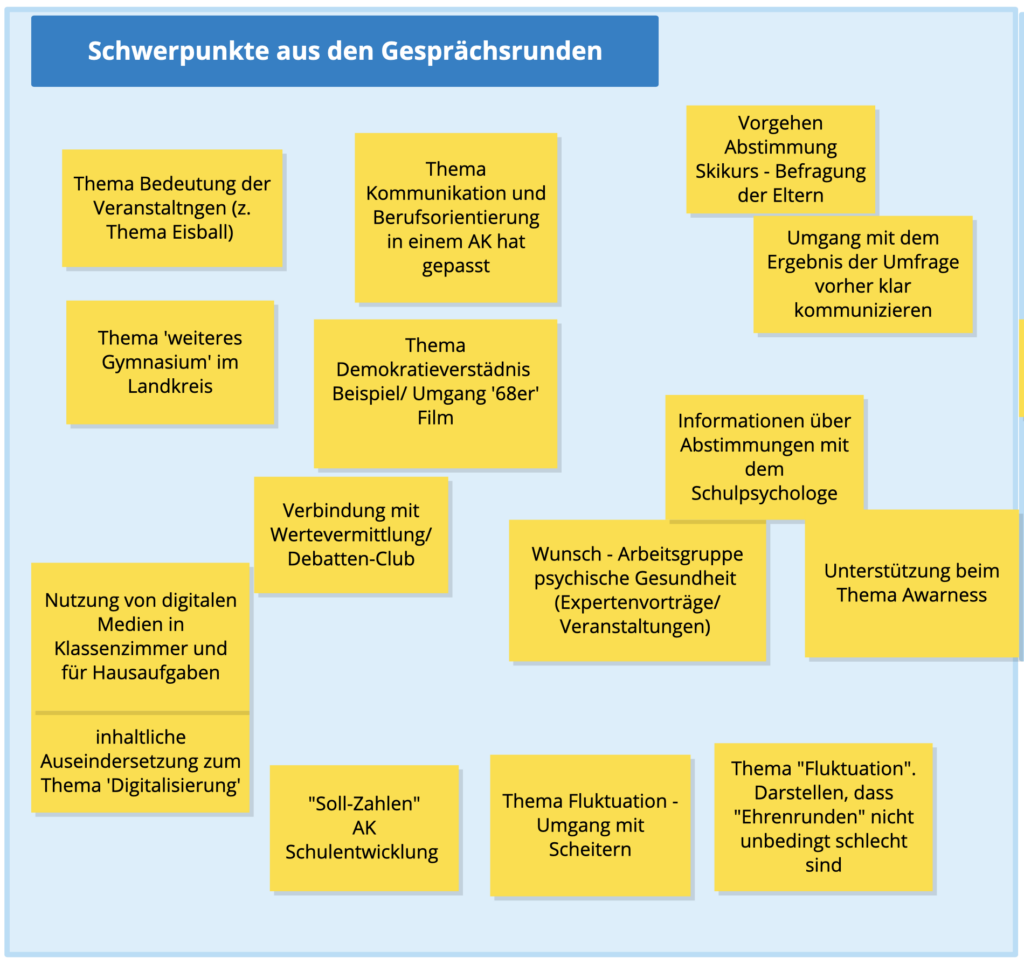 In einem ersten individuellen Brainstroming haben alle Teilnehmer:innen Themen für die AKs gesammelt. Diese Ideen werden jetzt in den gebildeten Gruppen geprüft und gegbenfalls ergänzt bzw. fokussiert. In der ersten ordentlichen Sitzung des Elternbeirats im März 2025 werden dann die jeweiligen Programme der Arbeitskreise vorgestellt und besprochen.